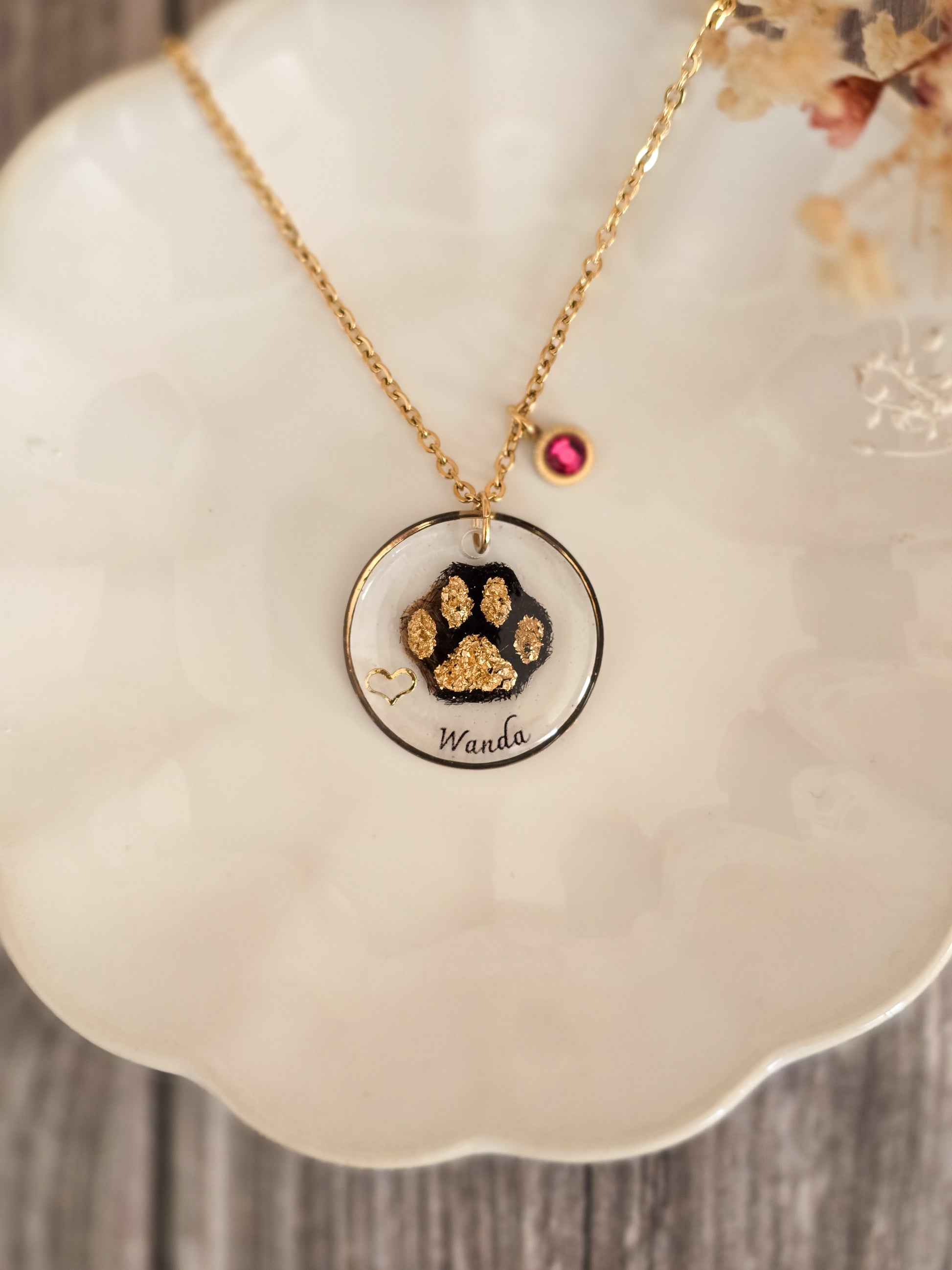 Son pendentif en forme de patte renferme votre souvenir, placé délicatement derrière les coussinets.
